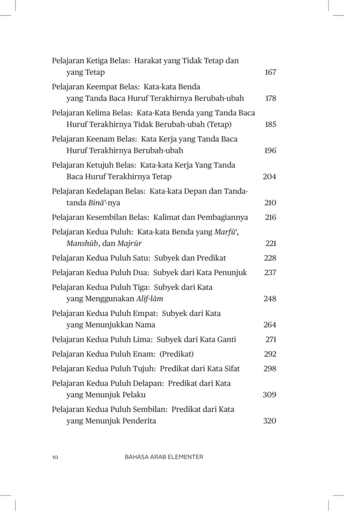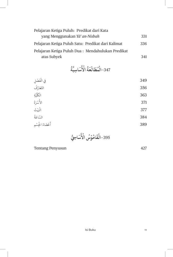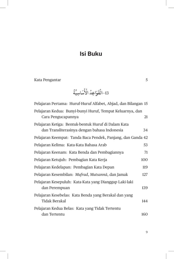 “Bahasa Arab itu sulit dan rumit.” Begitulah kesan yang muncul di tengah masyarakat, terutama kaum muslim. Kesan itu mungkin ada benarnya, karena bahasa Arab memiliki tiga keunikan pada tiga aspek: aspek kaidah tatabahasa (nahw), aspek bentukan kata (sharf), dan aspek maknanya (dalalah). Namun, melalui buku ini, kaidah-kaidah dasar bahasa Arab diulas secara mudah, praktis, dan runtut disertai bacaan sederhana dengan bahasa yang populer, mulai dari kosakata harian. Kosa kata yang digunakan disertai terjemahannya. Di akhir buku dilengkapi al-Qamus al-Asasi (makna kata-kata yang digunakan di dalam buku ini) yang disusun secara unik. Buku ini sengaja disiapkan untuk mempelajari bahasa Arab dengan bimbingan guru atau tanpa guru. Maka sangatlah tepat dibaca siapa saja yang ingin memahami dan menguasai bahasa Arab, pelajar di madrasah dan sekolah umum, para santri di pesantren serta masyarakat umum.